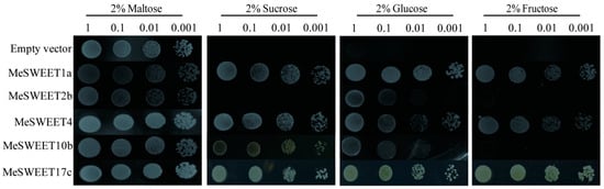 Five SWEET genes (MeSWEET1a, MeSWEET2b, MeSWEET4, MeSWEET10b, and MeSWEET17c) were expressed in the yeast mutant EBY.VW4000. Yeast cells expressing either MeSWEET1a or MeSWEET4 could grow on media supplemented with glucose, fructose and sucrose, suggesting that MeSWEET1a and MeSWEET4 can transport these three types of sugars in yeast, but both demonstrated high transport activity for glucose. MeSWEET2b showed weak activity for glucose transport. The expression of MeSWEET10b effectively restored the growth of EBY.VW4000 on media supplemented with sucrose. MeSWEET17c can transport sucrose, glucose, and fructose in yeast, especially with high transport activity for fructose (Figure 6).