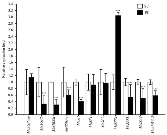 qRT-PCR results for starch biosynthetic and metabolic genes in PC compared with SC. The relative expression levels are normalized to MeActin. The x-axis represents the name of starch biosynthetic and metabolic genes. The y-axis represents the relative expression levels. The data represent the means of three biological replicates. All data are the means ± SE of three independent experiments. Significant differences are indicated by asterisk (*** p < 0.001). SC: M. esculenta Crantz cv. sugar cassava GPMS0991L; PC: M. esculenta Crantz cv. pink cassava BRA117315. MeAGPase, glucose-1-phosphate adenylyltransferase large subunit 1, MeAGPL, glucose-1-phosphate adenylyltransferase large subunit 3, MeGBSSI, granule-bound starch synthase, MeSSIII-1, starch synthase III-1, MeSP, glycogen phosphorylase, MeSP1, α-1,4 glucan phosphorylase 1, MeSP2, α-1,4 glucan phosphorylase 2, MeSPS1, sucrose-phosphate synthase 1, MeSPS3, sucrose-phosphate synthase 3, MeISA2, isoamylase 2, MeAMY3-2, alpha-amylase 3-2.