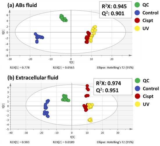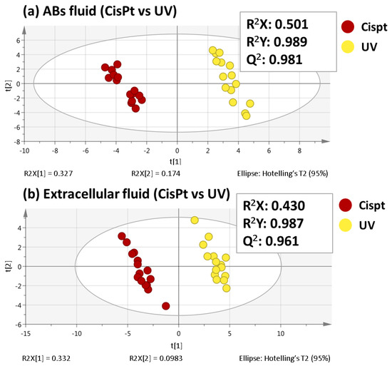 In order to find the most significant changes between ABs induced by cisplatin and ABs induced by UV light, partial least squares-discriminant analyses (PLS-DA) were performed for both sequences. Unlike PCA, PLS-DA is a supervised multivariate analysis that relies on the class membership of each observation. As Figure 2 shows a good separation between both groups was achieved and the values obtained for the R2X, R2Y, and Q2 parameters demonstrated the quality of these PLS-DA models. To assess the veracity of these models, a cross-validated ANOVA (CV-ANOVA) analysis was carried out. High F-values and low p-values were obtained in both fluids (F-value= 244.0 and p-value= 1.2 × 10−14 for ABs fluid; F-value= 139.7 and p-value= 1.0 × 10−11 for extracellular fluid).