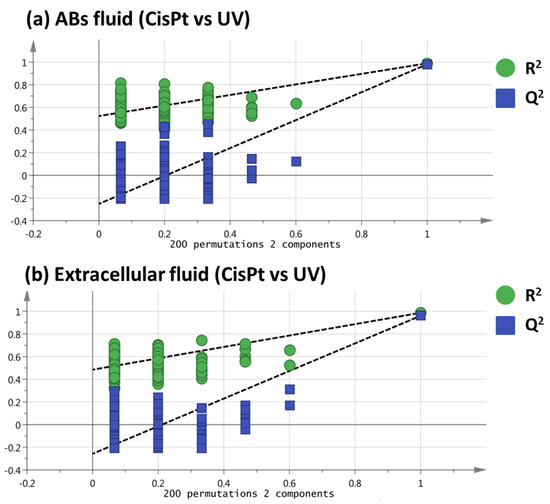 To ensure that the separation showed by PLS-DA was not achieved purely by chance, a permutation test using 200 permutations was performed, obtaining positive slopes for both ABs fluid and extracellular fluid (Figure 3), which emphasizes the veracity of the PLS-DA models [15]. Finally, a variable importance in the projection (VIP) value higher than 1.10 was used to select those variables that changed significantly between ABs induced by cisplatin and ABs induced by UV.