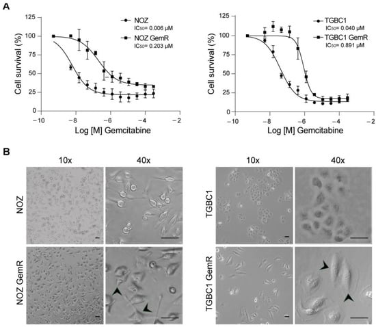 Gemcitabine-resistant sublines (NOZ GemR and TGBC1 GemR) were established by exposing parental cell lines to stepwise increased gemcitabine (Sigma-Aldrich, St. Louis, MO, USA) concentrations. In brief, cells at subconfluent densities were exposed to low doses of gemcitabine starting at absolute ~IC80 (2 nM for NOZ and 5 nM for TGBC1, as determined from the dose-response curves). At every two subcultures at 70% confluence, the concentration of gemcitabine was gradually increased until it reached 500 nM. The establishment of a stable gemcitabine-resistant subline was determined by comparing the IC50 values of parental and resistant cells after growing them in a gemcitabine-free medium for at least 1 month. The resistance index (RI) was determined as the ratio of the IC50 values between the resistant and parental cells. The stability of drug resistance was examined, when necessary, at monthly intervals.