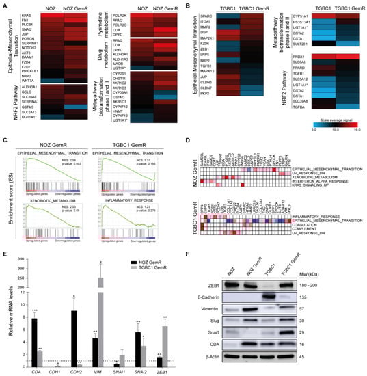 Biological processes dysregulated in gemcitabine-resistant cells. (A,B) Heat map representation of dysregulated pathways in NOZ GemR and TGBC1 GemR cells compared to parental cells. Data are expressed as the average signal expression of biological triplicates; (C) GSEA enrichment plots showing positively enriched biological pathways in each gemcitabine-resistant subline; (D) heat maps showing the clusters of upregulated genes (columns) of enriched biological processes (rows) in NOZ GemR and TGBC1 GemR cells according to the leading-edge analysis. The expression values are represented by colors from high (red) to low (dark blue); and (E,F) gene and protein expression of CDA and EMT regulators. Relative gene expression of each drug-resistant subline is compared to their respective parental cells normalized to 1 (dashed horizontal line). All data are representative of at least three independent experiments (mean ± SD). Statistical significance was determined using a two-tailed Student’s t-test with Welch’s correction (* p < 0.05, ** p < 0.01, and *** p < 0.001). Graph bars without an asterisk represent results without statistical significance.