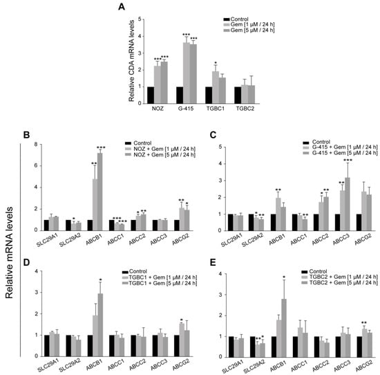 Differential gene expression induced by short-term exposure to gemcitabine. (A) Relative expression of CDA; and (B–E) the relative expression of genes encoding ENT1/2 and ABC transporters. Relative gene expression was normalized to TFCP2 and QARS (mean ± SD). All data are representative of three independent experiments (* p < 0.05, ** p < 0.01, and *** p < 0.001 by one-way ANOVA or Kruskal–Wallis test).