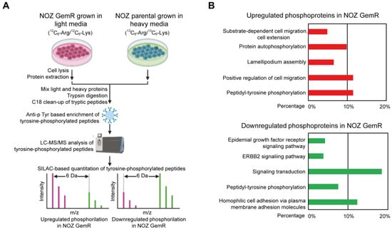 Dysregulated tyrosine phosphorylation in NOZ GemR cells quantified by SILAC. (A) SILAC quantitation experimental design. “Light” NOZ GemR cells (purple) and “heavy” NOZ parental cells (green) were lysed, mixed, and subjected to in-solution trypsin digestion. The tryptic peptides were enriched by an anti-phosphotyrosine antibody for tyrosine-phosphorylated peptides. The enriched phosphopeptides were analyzed on an Orbitrap Fusion Lumos Tribrid mass spectrometer. Upregulated and downregulated phosphorylation in NOZ GemR cells is revealed by the ratio of paired SILAC peaks. (B) GO biological process terms specific to upregulated (upper) and downregulated (bottom) phosphoproteins in NOZ GemR cells. The bars represent the percentage of proteins associated with the terms.