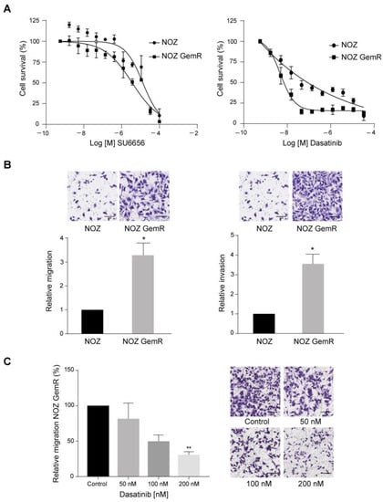 The in vitro effect of dasatinib on cell viability and the migration of NOZ GemR cells. (A) Dose-response curves of NOZ GemR and NOZ parental cells after 72 h of incubation with dasatinib and SU6656 (mean ± SD); (B) differential migratory and invasive capacity of NOZ GemR cells compared to NOZ parental cells (mean ± SD); and (C) relative cell migration in NOZ GemR cells after treatment with dasatinib (mean ± SD). Representative images: 10× magnification, scale bar: 250 µm. All data are representative of three independent experiments with three technical replicates. (* p < 0.05; ** p < 0.01 using the Kruskal–Wallis test).