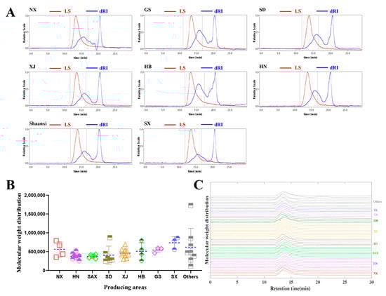 The MWD of polysaccharides of jujube fruits from different production bases by HPGPC-RID-MALLS. (A) Representative chromatogram of polysaccharides; (B) Distribution of MWD; (C) Fingerprint of polysaccharides.