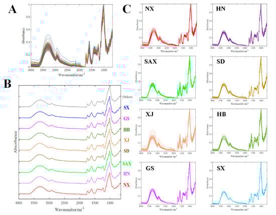 The spectra of polysaccharides of jujube fruits from different production bases by FT-IR. (A) Total fingerprint of polysaccharides; (B) Average map profiles of polysaccharides from different production bases; (C) Fingerprint of polysaccharides of jujube fruits from different production bases.