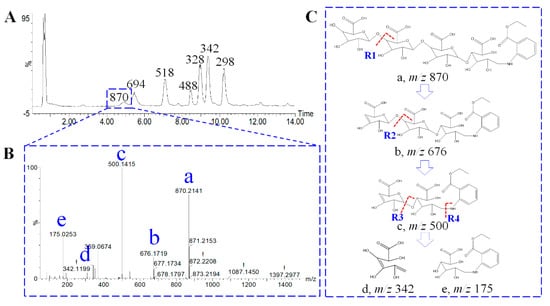 The partially hydrolyzed parameters, including trifluoroacetic acid concentration, hydrolysis temperature, and hydrolysis time, were optimized to acquire more kinds of oligosaccharides with high response intensity [31]. Then 1 mol/L trifluoroacetic acid, 100 °C hydrolysis temperature, and a 2 h hydrolysis time were used as the parameters for polysaccharides hydrolysis (Figure S5). After the derivatization with ABEE, the samples were injected into UHPLC-Q-TOF/MS. The base peak chromatogram of the oligosaccharides is exhibited in Figure 3A. Three monosaccharides (including arabinose, galacturonic acid, and glucose) and four oligosaccharides were characterized (Table 1). The oligosaccharides were mainly composed of galacturonic acid polymer (DP, 2–4). Take ABEE-four galacturonic acid polymers as an example; the characteristic fragments were expressly presented in MS/MS spectrum (Figure 3B). Tag a represented the [M-H]− of ABEE-four galacturonic acid polymers, and the precursor ion was m/z 870.21. Four featured positions (R1, R2, R3, R4) were ruptured continuously, and the featured fragments such as m/z 676.17, m/z 500.14, m/z 342.11, m/z 175.02. were presented (Figure 3C).