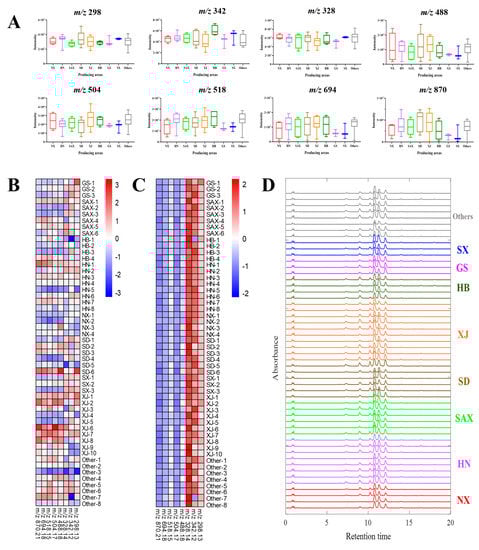 According to the optimized conditions, the 52 batches of polysaccharides samples originating from eight producing areas were disposed of and injected into a high-resolution mass spectrometer. In order to compare the distribution difference of oligosaccharides in different producing areas, the box plots of each oligosaccharide were demonstrated (Figure 4A). Meanwhile, the heat maps (longitudinal normalization and horizontal normalization) are shown in Figure 4B,C. The results showed that the distribution profile of oligosaccharides among different producing areas was similar. The polysaccharides readily hydrolyzed to monosaccharides, resulting in a high abundance of arabinose, galacturonic acid, and glucose. The abundance of oligosaccharides from XJ, SD, HN, and SAX was stronger than those from SX, NX, GS, and HB. Subsequently, the fingerprint of oligosaccharides was drawn (Figure 4D), and the profile of oligosaccharides from eight producing areas was semblable.
