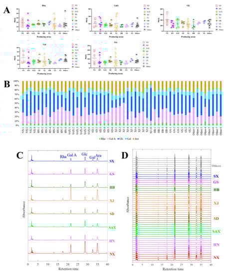 The polysaccharides were completely hydrolyzed and derivatized with PMP and then detected by UHPLC-UV. The methodology, including precision, repeatability, linearity, recovery, and stability, were examined, and the results were acceptable (Tables S6–S11, Figure S6). A total of 52 batch samples were detected, and the content of each monosaccharide was calculated and analyzed (Table S12). As shown in Figure 5A,B, the content of each monosaccharide distributed in different producing areas was similar, and the content of GalA, Glc, and Ara was higher than that of Rha and Gal. The content of Rha, GalA, Gal, and Ara showed significant intraspecific differences in XJ and HN. The composition proportion of monosaccharides presented remarkable differences. Furthermore, the representative chromatogram and fingerprint of monosaccharides were exhibited in Figure 5C,D. The results showed that the distribution profile of monosaccharides from different producing areas was approximately parallel. Glc, GalA, and Ara are the main peaks, and the absorption intensities of Rha and Gal are relatively low.
