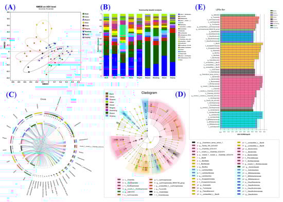 The modulatory effects of different jujube fruits polysaccharides on mice gut microbiota. (A) beta diversity of gut microbiota estimated by NMDS analysis on ASV level; (B,C) bar plot and Circos plot of microbiota community composition at genus level; (D,E) Cladogram plot and LDA score bar plot of LEfSe analysis of mice gut microbiota.
