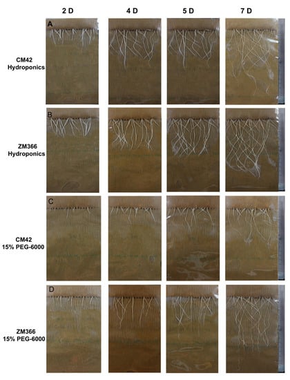 Root growth of CM42 and ZM366. (A) CM42 root growth under hydroponic conditions. (B) ZM366 root growth under hydroponic conditions. (C) CM42 root growth under the 15% PEG-6000 treatment. (D) ZM366 root growth under the 15% PEG-6000 treatment. Root growth was measured on days 2, 4, 5, and 7.