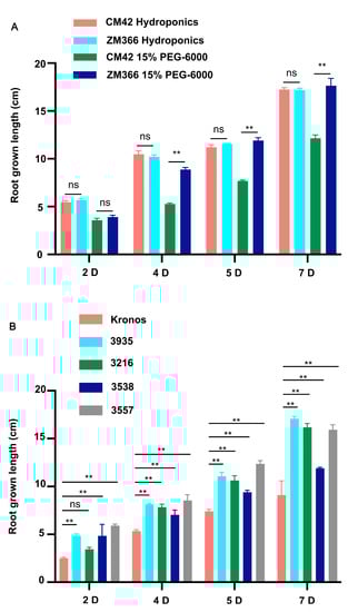 Root growth length statistics. (A) Statistics of CM42 and ZM366 under hydroponics and the 15% PEG-6000 treatment. (B) Statistics of Kronos and 4 EMS-induced mutants under the 15% PEG-6000 treatment. Growth was measured on days 2, 4, 5, and 7. The experiment was repeated three times, and the error bar represents the SD of the means (n = 3). ** represents p < 0.01. ns indicates not significant.