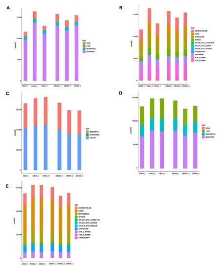 Statistics for variant sites, including InDels and SNPs. (A) InDel-impact was plotted for four levels: high, moderate, low, and modifier. (B) InDel-region was counted for the following gene structure regions: downstream, exon, intron, intergenic, splice_site_acceptor, splice_site_donor, and splice_site_region, transcript, upstream, utr_3_prime and utr_5_prime. (C) SNP-function was statistically plotted for three conditions: synonymous mutation, missense mutation, and nonsense mutation. (D) SNP-impact was statistically plotted for four levels: high, moderate, low, and modifier. (E) SNP-region was counted and mapped for the following gene structure regions: downstream, exon, intron, intergenic, splice_site_acceptor, splice_site_donor, and splice_site_region, transcript, upstream, utr_3_prime and utr_5_prime.