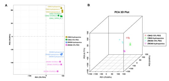 Principle Component Analysis (PCA) (A) CM42-hydroponics, CM42-15% PEG, ZM366-hydroponics, and ZM366-15% PEG PCA of a PCA 2D plot. (B) CM42-hydroponics, CM42-15% PEG, ZM366-hydroponics, and ZM366-15% PEG PCA of a PCA 3D plot. PC1 refers to the top contribution rate, which is the factor that has the greatest influence on variation, and PC2 is the second factor.