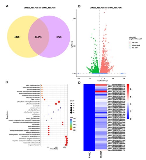 Transcriptomic analysis of ZM366 and CM42 treated with 15% PEG-6000. (A) Venn diagram of expressed genes in ZM366 and CM42 under 15% PEG-6000 treatment conditions. The yellow represents the genes expressed in ZM366. The purple represents the genes expressed in CM42. (B) Volcano map of differentially expressed genes (DEGs) in ZM366 and CM42 under 15% PEG-6000 treatment conditions. Up, 6239; down, 4844. (C) GO enrichment analysis bubble diagrams. The abscissa represents the ratio of the number of DEGs annotated with a GO term to the total number of DEGs, and the ordinate is the GO term; the size of the point represents the number of genes annotated with a GO term, and the color change from red to purple represents the significance of the enrichment. (D) Expression heatmap of the GO enrichment DEGs between CM42 and ZM366 under 15% PEG-6000 treatment conditions.