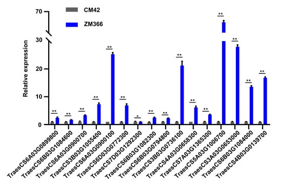 Expression patterns revealed by RT-qPCR. The expression patterns of 16 highly expressed genes in ZM366 compared with CM42 (both treated with 15% PEG-6000) as revealed by RT-qPCR. The experiment was repeated three times, and the error bar represents the SD of the means (n = 3). ** represents p < 0.01. * represents p < 0.05.