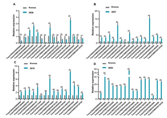 Expression patterns revealed by RT-qPCR treated with 15% PEG-6000. (A) The expression patterns of 16 highly expressed genes in mutant 3538 compared with Kronos, mutant 3557 (B), in mutant 3216 (C), and in mutant 3935 (D). The experiment was repeated three times, and the error bar represents the SD of the means (n = 3). ** represents p < 0.01. ns indicates not significant.