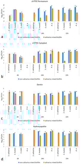 In order to investigate the difference between non-salivarius and salivarius mixed biofilms, the accompanying growth of certain bacterial species during biofilm formation was determined. The results are shown in Table S1 and Figure 1. The following observations can be drawn: (a) In the 24-h mixed salivarius streptococcal biofilm, S. mutans was represented in a significantly lower number than in the non-salivarius mixed biofilm. (b) In the 72-h mixed biofilm, the representation of S. mutans differed depending on the material on which the biofilm was formed. Lower values of CFU/mL were present in the salivarius mixed biofilm created on dentin and hydroxyapatite. In contrast, on d-PTFE membranes, lower values of CFU/mL were present in the mixed biofilm without S. salivarius. (c) In the 72-h biofilm, on all materials, the number of A. actinomycetemcomitans was significantly lower in the salivarius mixed biofilm.
