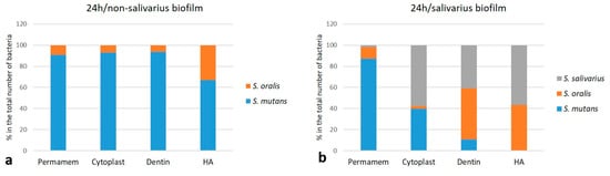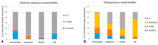 Distribution (%) of individual bacterial species on Permamem and Cytoplast d-PTFE membrane, dentin and hydroxyapatite (n = 9); (a) 72-h non-salivarius mixed biofilm; (b) salivarius mixed biofilm.