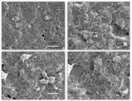 Representative SEM micrographs of a 72-h biofilm on hydroxyapatite. Different magnifications of salivarius mixed biofilm are presented in (a,b), while different magnifications of non-salivarius mixed biofilm are presented in (c,d); Magnification of 2000× and 5000×.