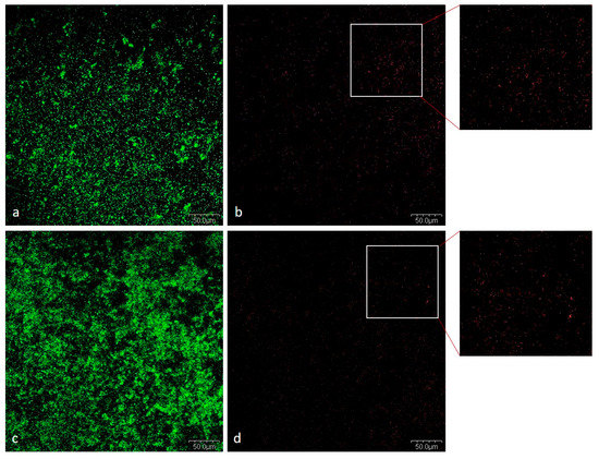 The viability of bacteria in the 72-h biofilm was tested using the LIVE/DEAD staining technique. LIVE/DEAD BacLight Bacterial Viability Kit L—7012 (Thermo Fisher Scientific, Waltham, MA, USA) was used in the staining procedure. Biofilms were grown as described in Section 4.3. on d-PTFE membranes. Biofilms were gently washed and covered with 5 µL of Propidium iodide and 5 µL of SYTO 9 in 990 µL of sterile distilled water. This was followed by incubation for 15 min at RT in the dark. After washing out the dye, an epifluorescence microscope with GFP/FITC (ex: 480 nm and em: 500 nm) and rhodamine (ex: 490 nm and em: 635 nm) filters were used for observation. All preparations were prepared in triplicate, and five visual fields of the prepared preparations were examined.