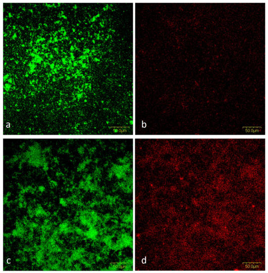 FilmTracer SYPRO Ruby Biofilm Matrix Stain and SYTO 9 (Thermo Fisher Scientific, Waltham, MA, USA) were used to stain cells and biofilm matrix simultaneously. Biofilms were grown as described in Section 4.3. on d-PTFE membranes. Biofilms were gently washed and covered with 200 µL of SYPRO Ruby Biofilm Matrix Stain solution for matrix staining. The sample was incubated for 30 min at room temperature and protected from light. After gentle washing with sterile distilled water, bacterial cells were stained with diluted SYTO 9 dye for 3 min, followed by washing and observation using an epifluorescence microscope with GFP/FITC (ex: 480 nm and em: 500 nm) and rhodamine (ex: 580 nm and em: 700 nm) filters.
