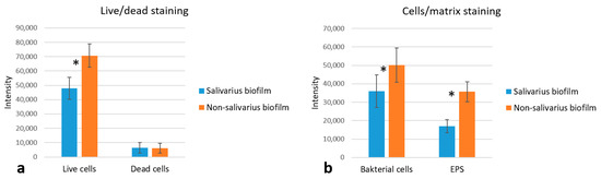By staining cells and EPS within the 72-h mixed biofilm, we confirmed the results obtained by SEM analysis. The presence of S. salivarius K12 increased the biofilm’s biomass due to the creation of an EPS-rich matrix and the development of a complex biofilm structure (Figure 7). The average fluorescence intensity of the different experimental groups (for both the dead and live bacterial cells group and the EPS and live bacterial group) can be found in Figure 8.