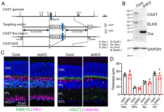 To assess the role of CAST and ELKS in retina formation, we analyzed double KO mice, where CAST was globally deleted and ELKS was conditionally knocked-out using a retinal Cre expressing mouse (specifically the Crx-Cre strain), as described previously [8]. The Crx-Cre mouse expresses Cre recombinase under control of a photoreceptor-specific transcription factor [20,21]. Our immunohistochemistry analysis using anti-Cre antibody revealed a weak signal in INL neurons and a strong signal in ONL photoreceptors, which facilitated the depletion of ELKS in the OPL and IPL in the ELKS flox mouse [8]. In the previous double KO mouse (CAST KO and ELKS cKO), we were concerned with unknown roles of CAST in non-neural cells, including glial cells. Here, we generated CAST-flox mice for targeted deletion of exon 14 (Figure 2A), which causes a frameshift, resulting in premature termination. Because the family of CAST and ELKS proteins are both distributed at the synaptic OPL and IPL of the retina [7,22], and have been suggested to have complementary functions [7,8,23], we crossed CAST-flox mice with ELKS-flox mice to generate CAST/ELKS-double-floxed (dflox) mice, which were then crossed with retinal Cre-expressing Crx-Cre mice. In the resulting mice with retinal double cKO in photoreceptor neurons, the CAST and ELKS proteins in the retina were eliminated, as revealed by immunoblotting (Figure 2B).