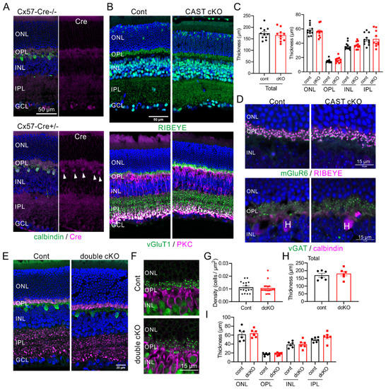 In previous reports on the CAST KO mouse, we showed horizontal cell degeneration using 3D reconstruction of electron microscopy images [8]. These results indicated that the ectopic localization is caused by CAST deficiency in horizontal cells. Here, we generated a horizontal cell-specific Cre recombinase-expressing line of mice (Cx57-Cre), according to a previous report [24], and crossed these with CAST-flox mice. Immunohistochemistry using anti-Cre antibody revealed specific Cre expression in anti-calbindin positive horizontal cells in the INL (Figure 3A). Subsequently, we generated a horizontal cell CAST and ELKS double-deletion mutant (CAST/ELKS-dflox;Cx57-Cre+/− [double cKO]). In retinal homogenate from this double cKO, the expression of CAST and ELKS were slightly but not significantly reduced compared with the control retina (Supplemental Figure S2). These results suggest that the majority of CAST and ELKS were expressed at the photoreceptor and bipolar cell terminal in the OPL and IPL. In the CAST-flox;Cx57-Cre+/− (CAST cKO) mouse, the photoreceptor ribbon synapses (by anti-RIBEYE antibody) and terminals (by anti-vGluT1 antibody) were distributed normally in the OPL, and layer formation was not significantly different from the control (Figure 3B,C). Furthermore, the photoreceptor ribbon synapses were localized with the postsynaptic ON bipolar cell tips, as indicated by mGluR6 labeling (Figure 3D), and the inhibitory terminals, labeled by vGAT, were localized on anti-calbindin antibody labeled horizontal cell dendrites in the OPL (Figure 3D).