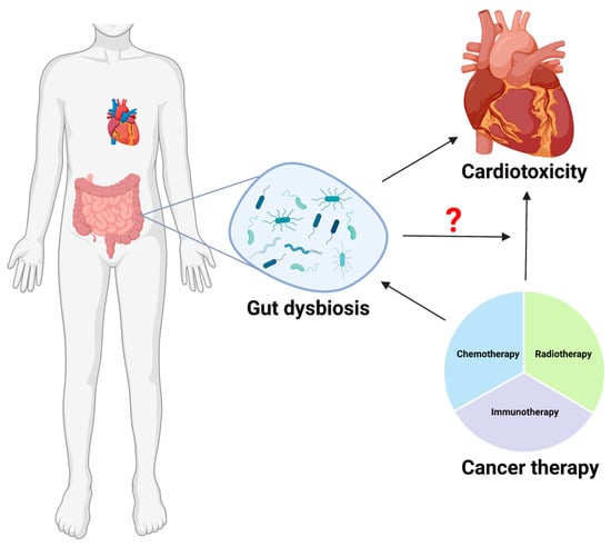 Over the past several decades, tremendous efforts have been made to develop a range of treatment options for cancer, including chemotherapy, radiotherapy, immunotherapy, and surgery, all of which have significantly reduced the mortality and morbidity associated with various forms of cancer []. Although the benefits of anticancer drugs and therapies are undeniable, safety aspects cannot be overlooked; for example, some treatments have been found to adversely affect the cardiovascular system [,]. Cardiotoxicity is a crucial factor to consider for individuals receiving cancer therapy because, even though most patients will recover from cancer, they will then have elevated long-term cardiac risks [,]. However, in-depth insights into the underlying molecular mechanisms and causal agents are lacking. Interestingly, a pioneering study including 1526 tumors and their adjacent normal tissues across seven cancer types (breast, lung, ovary, pancreas, melanoma, bone, and brain tumors) reported a distinct microbiome composition specific to cancer types []. The authors also correlated bacteria identified in the tumor microenvironment (TME), or their predicted functions, with tumor types and subtypes, smoking status, and response to immunotherapy []. Similarly, one of the long-term effects of cancer treatment is a shift in the composition of the gut microbiome, termed gut dysbiosis []. Importantly, low-grade chronic inflammation is one of the hallmarks of cardiac diseases and cancers, and is also caused by gut dysbiosis and an altered intestinal permeability barrier. Can the gut microbiome be the missing link? Well-directed and thorough research is required to answer these questions.