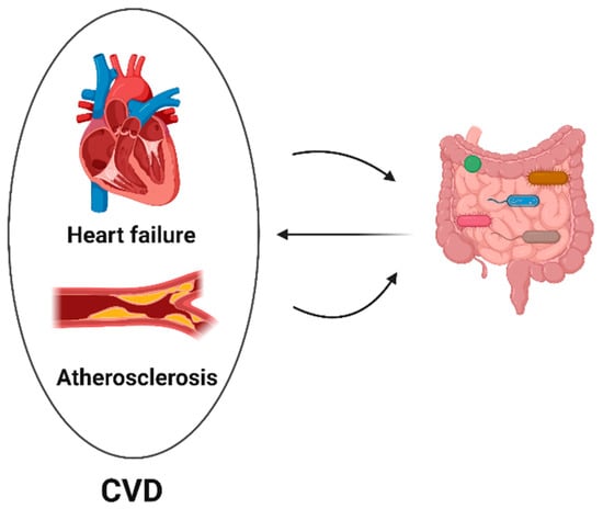 Recent studies have highlighted a possible contribution of the gut microbiome to CVD. CVDs is linked to a higher Firmicutes/Bacteroidetes (F/B) proportion. The phylum Bacteroidetes was found to be negatively associated with ischemic heart disease (IHD), and the order Lactobacillales was positively associated with IHD in a small case-control study (n = 128) []. Type 2 diabetes mellitus, a key CVD risk factor, has been sparsely linked to Acidaminococcus, Aggregatibacter, Anaerostipes, Blautia, Desulfovibrio, Dorea, and Faecalibacterium []. The reduced abundance of bacteria that produce short-chain fatty acids (SCFAs), such as Roseburia, Faecalibacterium, and Eubacterium rectale, and an increased abundance of host opportunistic pathogens, such as Escherichia coli, Clostridium ramosum, Bacteroides caccae, and Eggerthella lenta have been linked to a higher risk of CVDs [,]. Researchers have found that, compared to healthy controls, patients with atherosclerosis have reduced relative abundances of Roseburia and Eubacterium and greater relative abundances of Collinsella []. Intestinal mucosal barrier degradation and dysbacteriosis caused by lower cardiac output in HF are accompanied by elevated levels of pathogenic bacteria, such as Candida, and decreased levels of anti-inflammatory bacteria, such as Faecalibacterium prausnitzii. Additionally, elevated levels of some gut bacterial species, such as Escherichia coli, Klebsiella pneumonia, and Streptococcus viridans have been linked to heart failure [].