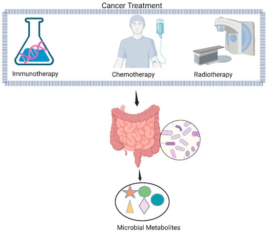 Over the past century, tremendous progress has been made in cancer treatment, resulting in improved quality of life and survival for cancer patients. However, these advances in cancer treatment are often accompanied by treatment-related complications, including secondary systemic side effects. Recently, there has been increasing evidence that cancer treatments can disrupt the host immune response, leading to gut dysbiosis, disturbed immune system, and reduced effectiveness of the treatment [,]. Several studies have shown that the absence of gut microbiota reduces therapeutic efficacy, suggesting that commensal microbes modulate treatment-induced anticancer immune responses through various mechanisms. Ground-breaking results from animal models demonstrated the importance of commensals in regulating the effectiveness of radiation therapy, chemotherapy, and immunotherapy drugs [,,]. For example, the intestinal microbiota and the myeloid cells that infiltrate tumors while a patient is receiving platinum-based therapy have been linked together []. The current understanding of the relationships among gut bacteria, host reactions, and anticancer medication was analyzed by Huang et al. in 2022 [], with an emphasis on the immunomodulatory function of microbiota, which supports the effectiveness of immune checkpoint inhibitors. Importantly, this work focuses on the intricate and dynamic relationships between the microbiota and anticancer drugs, as well as the possibility for microbiome-based therapies to potentially enhance the effectiveness of cancer treatment. Huang and colleagues discovered that the gut microbiota affects the pharmacokinetics and pharmacodynamics of anticancer drugs. Furthermore, their work emphasizes the possibility of using microbiota-based therapies, such as probiotics or fecal microbiota transplantation, to increase the efficacy and decrease the toxicity of anticancer medications, as well as the response to immunotherapy. Additionally, anticancer medication response and individualized cancer treatment may be predicted using microbiota-based biomarkers. Nevertheless, additional systematic studies are required in order to completely comprehend the complex connections between the microbiota and anticancer therapies and determine the best methods for modifying the microbiota in order to improve cancer treatment outcomes.