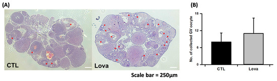 Characterization of lovastatin-treated ovaries. (A) Light microscopic images of hematoxylin and eosin-stained mouse ovarian tissue treated without (CTL) and with lovastatin (Lova). Asterisk is primary oocyte and follicles. Scale bar = 250 µm. (B) Number of GV oocytes collected from control and lovastatin-treated ovaries. Data are the mean ± standard error of the mean of four replicates. Control mice ovaries (n = 30) and Lovastatin-treated mice ovaries (n = 30).