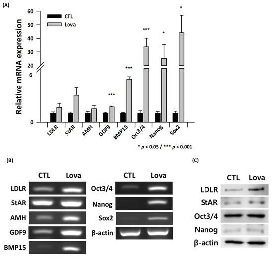 Expression of steroidogenesis and ovarian function markers in lovastatin-treated ovaries. (A) Quantitative real-time PCR analysis of LDLR, StAR, AMH, GDF9, BMP15, Oct3/4, Nanog, and Sox2 expression normalized against β-actin expression in control (CTL) and lovastatin-treated (Lova) ovaries. Data are the mean ± standard error of the mean of three replicates (* p < 0.05 and *** p < 0.001 versus the control group) (n = 3). (B) RT-PCR analysis of control (CTL) and lovastatin-treated (Lova) ovaries. (C) Western blot analysis of control (CTL) and lovastatin-treated (Lova) ovaries.