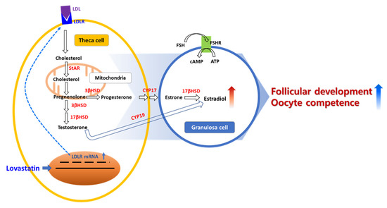 Steroidogenesis in ovaries is important for cumulus–oocyte complexes and follicular granulosa cells (Figure 5). Therefore, steroidogenesis occurs in follicles depending on the developmental stage and gonadotropin status. In preantral follicles, E2 and progesterone are produced by cumulus and granulosa cells in the ovary, as indicated by the high expression of 3-β-hydroxy-steroid-dehydrogenase and cholesterol side-chain cleavage enzyme, and androgens are synthesized and converted into 17β-estradiol by granulosa aromatase P450 [20]. The biosynthesis of steroids in granulosa and cumulus cells in the ovary is associated with ovarian function such as follicular development, oocyte maturation, and oocyte quality [6,21,22]. Lovastatin affects the gonadotropin-independent and -dependent phases of follicular development via LDLR signaling.