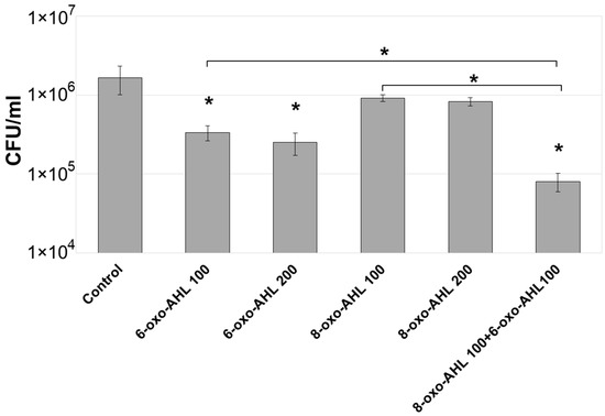 The colony forming unit (CFU) titer at which adaptive proliferation was terminated in Pectobacterium atrosepticum starving cultures with a low initial population density (103 CFU/mL). Starving cultures were incubated in the absence of exogenous acyl homoserine lactones (AHL) (Control), or in the presence of either 100 or 200 µM of either 6-oxo-AHL or 8-oxo-AHL, or in the presence of both 6-oxo-AHL and 8-oxo-AHL each at 100 µM concentration. The presented values are the means ± SD of three biological replicates. Asterisks (*) show a significant difference (Mann–Whitney two-sided test, p < 0.05) from the control or between the variants designated by brackets.
