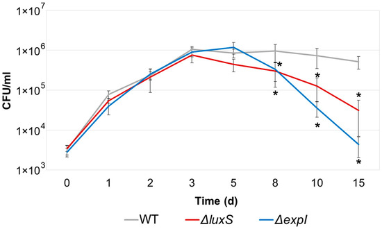 The dynamics of the colony forming unit (CFU) titer in the starving cultures of the wild type Pectobacterium atrosepticum (WT, grey line) and its ΔexpI (blue line) and ΔluxS (red line) mutants. Cultures were incubated in a carbon-deficient medium at low initial population densities (2–4 × 103 CFU/mL). The presented values are the means ± SD of four-five biological replicates. Asterisks (*) show a significant difference (Mann–Whitney two-sided test, p < 0.05) between the wild type and mutant strains at each time point.