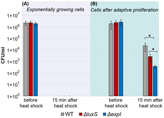 Heat shock resistance of the wild type Pectobacterium atrosepticum (WT, grey column) and its ΔexpI (blue column) and ΔluxS (red column) mutants. Cells sustained under two culture conditions were assayed: (A) cells grown in LB medium until the late log phase and (B) cells that passed through adaptive proliferation in a carbon-deficient medium. The duration of the heat shock was 5 min. Fifteen minutes after the heat shock was abolished, and the cell suspensions were plated to determine the CFU titer. The presented values are the means ± SD of three biological replicates. Asterisks (*) show a significant difference (Mann–Whitney two-sided test, p < 0.05) between the variants designated by brackets.