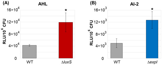 The levels of acyl homoserine lactones (AHL) (A) and autoinducer-2 (AI-2) (B) in the supernatants of starving cultures of Pectobacterium atrosepticum that passed through adaptive proliferation. AHL was measured in the wild type strain (WT, grey column) and AI-2-deficient ΔluxS mutant (ΔluxS, red column) (A); AI-2 was measured in the wild type strain (WT, grey column) and AHL-deficient ΔexpI mutant (ΔexpI, blue column) (B). The presented values are the means ± SD of three biological replicates. Asterisks (*) show a significant difference (Mann–Whitney two-sided test, p < 0.05).