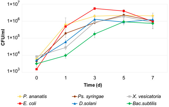 The dynamics of the colony forming unit (CFU) titer in the starving cultures of Pantoea ananatis (yellow line), Pseudomonas syringae (black line), Xanthomonas vesicatoria (grey line), Escherichia coli (red line), Dickeya solani (blue line), and Bacillus subtilis (green line). Cultures were incubated in a carbon-deficient medium at low initial population densities (2–9 × 103 CFU/mL). The presented values are the means ± SD of three biological replicates.