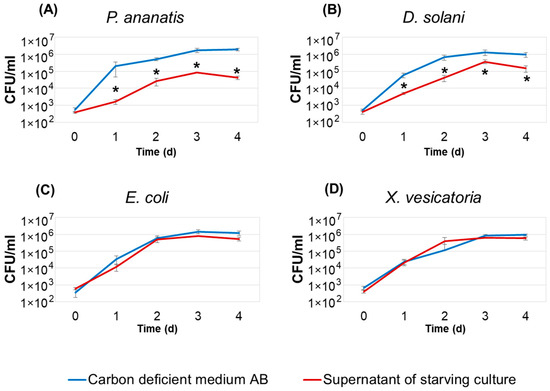 The effect of the supernatants of the Pectobacterium atrosepticum starving cultures that passed through adaptive proliferation on the adaptive proliferation of Pantoea ananatis (A), Dickeya solani (B), Escherichia coli (C), and Xanthomonas vesicatoria (D). Cultures were incubated at low initial population densities in either a fresh carbon-deficient medium (blue line) or supernatants of P. atrosepticum starving cultures (red line). The presented values are the means ± SD of three biological replicates. Asterisks (*) show a significant difference (Mann–Whitney two-sided test, p < 0.05) between the colony forming unit (CFU) titers in cultures incubated in a fresh carbon-deficient medium vs. that in cultures incubated in the supernatants of the P. atrosepticum starving cultures.