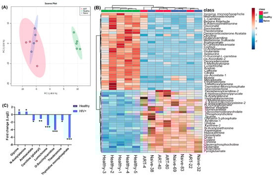 Plasma metabolic profiles of HIV+ patients (treatment-naïve and ART-treated): (A) Scatter plot showing partial least-square discriminant analysis (PLS-DA) of plasma metabolomic profiles. The two principal components explaining the highest variance were plotted on X and Y axis; (B) heatmap shows the top 60 differentially abundant metabolites identified in a comparison between healthy donors and HIV patients at 5% FDR; (C) fold change in abundance of 6 selected metabolites computed from metabolome profiles in a comparison between HIV patients and healthy donors. The bars represent log2 fold change in HIV patients compared with healthy donors. The asterisks *, **, and *** denote FDR < 0.05, FDR < 0.01, and FDR < 0.001, respectively.