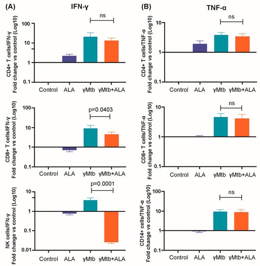 IFN-γ and TNF-α gene expression profile of various immune cells in γMtb-cultured PBMCs of LTBI+ donors. PBMCs of healthy LTBI+ donors were cultured with or without γMtb (10 μg/mL) and in the presence or absence of ALA, as mentioned in the Methods section. After 48 h, various immune cells were isolated via flow sorting, RNA was collected, and real-time PCR analysis was performed to determine IFN-γ and TNF-α gene expression: (A) IFN-γ transcription levels in different cell types; (B) TNF-α transcription levels in different cell types. PBMCs from five LTBI+ donors were used for the study. Paired t-tests were used to compare the differences between untreated and treated PBMCs from the same samples. The significant p values are shown (p < 0.05). ns: not significant.