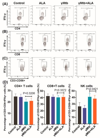 IFN-γ levels of various immune cells in γMtb-cultured PBMCs of LTBI+ donors. PBMCs of healthy LTBI+ donors were cultured with or without γMtb (10 μg/mL) and in the presence or absence of ALA, as mentioned in the Methods section. After 48 h, intracellular staining was performed to determine IFN-γ levels of various immune cell populations: (A–C) IFN-γ staining of a representative donor PBMC; the top, middle and bottom panels represent CD4+ T cells (A), CD8+ T cells (B), and NK cells (C), respectively. The percentages of IFN-γ-positive cells are shown; (D) collective summary of IFN-γ-positive CD4+, CD8+, and CD56+ cells of five donors. Paired t-tests were used to compare the differences between untreated and treated PBMCs from the same samples. The significant p values are shown in the figure.