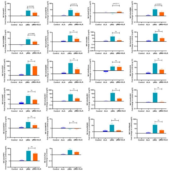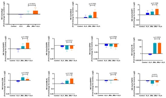 In the above-cultured NK cells, we also determined the expression of 11 key genes involved in various death pathways (i.e., autophagy, apoptosis, pyroptosis, necroptosis, and ferroptosis). We found that ALA did not affect the cell death pathways tested in this study, while Atg3 expression (autophagy-related gene) alone was significantly upregulated when compared to the untreated and γMtb-stimulated cells (p = 0.0023) (Figure 6).