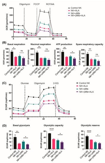 Metabolic switch to a glycolytic/energetic phenotype supports diverse NK cell functions [16,17]. We determined whether ALA treatment affects the metabolic state of γMtb-cultured NK cells. We performed a metabolic flux assay (as mentioned in the Methods section) to detect changes in the mitochondrial oxygen consumption rate (OCR) and the rate of extracellular acidification (ECAR) as measures of oxidative phosphorylation and glycolysis, respectively.