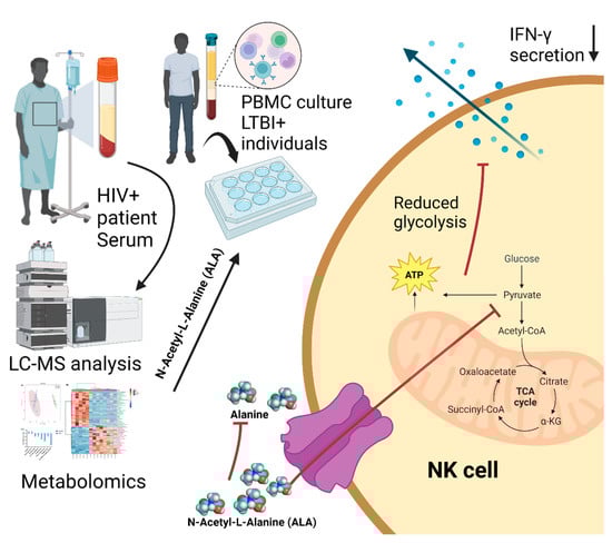 However, little is known about how HIV-driven host metabolite changes can dysregulate the immune system and control Mtb immunopathogenesis, which is an important question that needs to be answered in terms of controlling Mtb progression in HIV–Mtb co-infected patients. In this study, we performed a metabolomic comparison using the plasma from healthy donors and HIV-infected patients (with or without antiretroviral therapy (ART)). One of the metabolites, N-acetyl-L-alanine (ALA) was more abundant in HIV+ plasma than in healthy donor samples. ALA inhibited pro-inflammatory cytokine IFN-γ production by the NK cells of LTBI+ individuals. We also found that ALA inhibited the glycolysis of LTBI+ individuals’ NK cells in response to Mtb. Our findings demonstrate that HIV infection enhances plasma ALA levels to inhibit NK-cell-mediated immune responses to Mtb infection.
