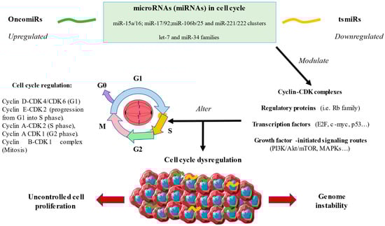 A general overview of the role of microRNAs in the cell cycle. As shown, various dysregulated oncogenic miRNAs (OncomiRs) and tumor-suppressive miRNAs (tsmiRs) are able to modulate a set of products involved in the control and progression of the cell cycle, therefore leading to cell cycle dysregulation. Consequently, two major hallmarks of cancer are promoted: uncontrolled cell proliferation and genome instability.