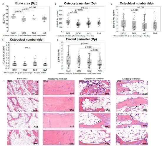 Bone turnover in mild CKD models—static bone histomorphometry: (A)—bone area (B.Ar%T.Ar; n = 8 for each group); (B)—osteocyte number in the diaphyseal (Dp) region (N.Ot/T.Ar, no/mm2; n(SO2) = 72, n(SO6) = 74, n(Nx2) = 73, n(Nx6) = 72); (C)—osteoblast number in the metaphyseal (Mp) region (N.Ob/B.Pm, no/mm; n = 80 for each group); (D)—osteoclast number (N.Oc/B.Pm, no/mm; n(SO2) = 74, n(SO6) = 76, n(Nx2) = 72, n(Nx6) = 77); (E)—eroded perimeter (E.Pm.%B.Pm; n = 80 in each group); non-significant differences between groups are not indicated; (F)—representative microphotographs for the bone static histomorphometry parameters in the control (SO2) and mild CKD (SO6, Nx2, and Nx6) groups (H&E; arrowheads point osteoblasts and eroded perimeter at the corresponded pictures); n.s.—not significant.